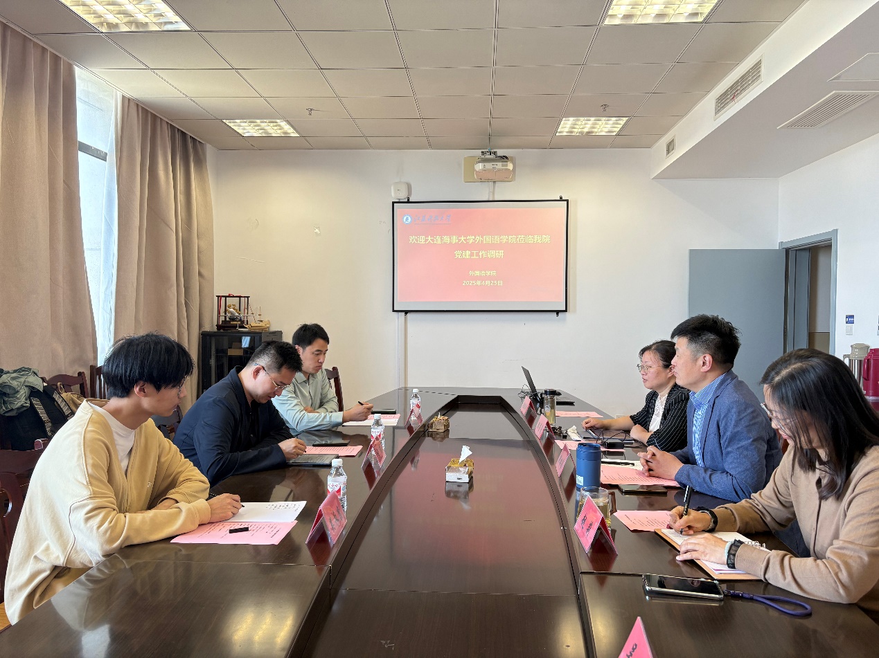 425日,大连海事大学外国语公司党办主任刘东宇、英语系主任于洋等莅临公司开展党建工作专题调研。公司党委书记姚双良、副书记赵莉、副经理韩菁菁、大外三部主任吴颖等参加调研交流。交流会由赵莉主持。