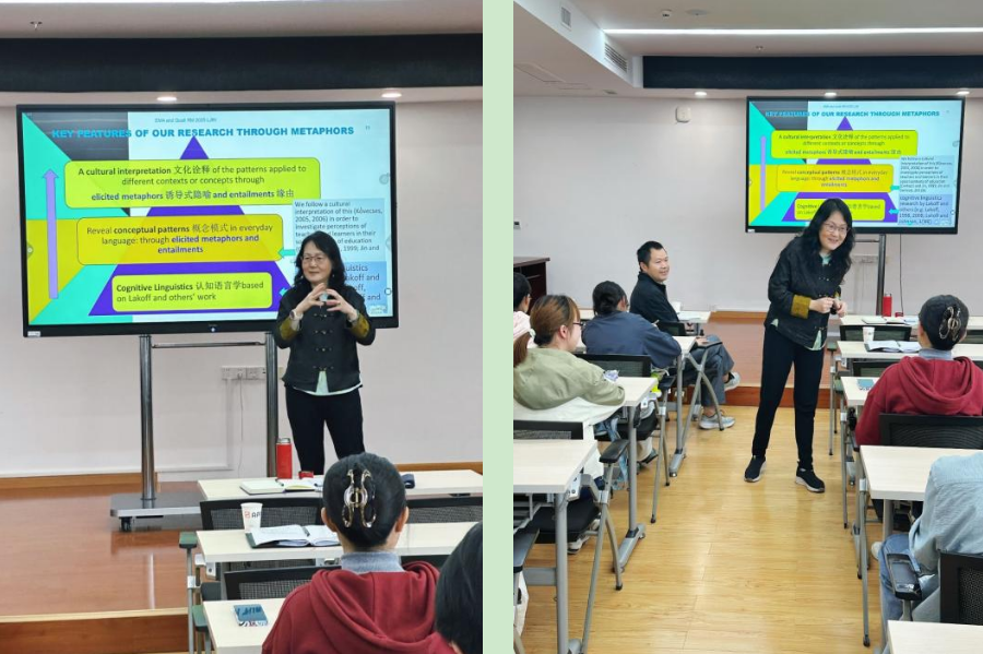 随后,金教授以“What is a teacher?” 问题为例,完整展示了诱导隐喻分析的实际操作流程。从数据收集方法的设计,到识别和分类隐喻,再到解读隐喻背后的意义,金教授结合实例对每一步都进行了详细阐述。在解读东西方文化中关于教师隐喻的对比分析中,金教授指出东方文化对教师作为“园丁”和“蜡烛”的隐喻强调了教师默默奉献、辛勤培育的形象;而西方文化对教师作为 “引导者”“启发者”的隐喻突出教师对员工思维引导、智慧启迪的作用。由此,金教授进一步指出隐喻不仅是语言表达的修辞手段,更是文化和思维的映射,通过对不同文化中隐喻的分析,可以进一步深入了解文化间的差异与共性,为跨文化交流和理解提供新视角。金教授深入浅出的阐释,让在场师生们对诱导隐喻分析在实际研究中的应用有了直观清晰的认识,更拓宽了大家对隐喻研究应用领域的认知。