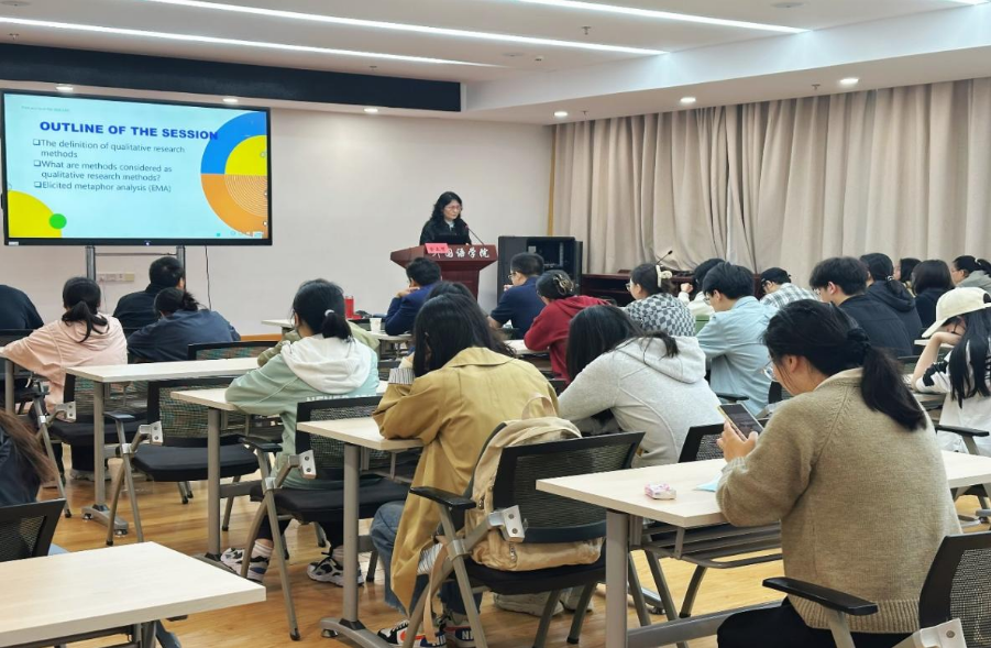 讲座开始,金立贤教授首先对定性研究方法进行了全面解读。她从研究的基本目的、数据收集方式和分析逻辑入手,详细阐述了定性研究在语言学领域的重要作用和核心特点。在此基础上,金教授引入了本次讲座的核心—— 诱导隐喻分析。金教授指出,诱导隐喻分析通过对语言隐喻现象的探究,挖掘人们思考时的认知模式,对理解语言和思维关系有重要意义。在理论讲解环节,金教授对比了传统隐喻研究方法和诱导隐喻分析的异同,指出传统隐喻方法在收集数据和分析角度上存在一定局限,而诱导隐喻分析在研究设计上更主动,数据处理更系统,能够更深入、全面地揭示语言背后的认知过程。