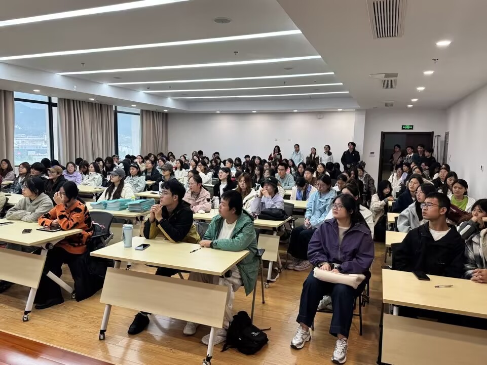 张天皓博士以“在关西大学的学习生活体验”为主题,系统介绍了这所日本百年私塾的深厚人文底蕴与“知识实践”教育理念。他重点分享了该校在日本文化研究、社会学及商业设计等领域的突出表现,并讲述了关西地区丰富的历史文化资源如何与学术研究相结合,以及学校完善的外国职工支援体系,为同学们展现了一幅生动而独特的关西留学画卷。