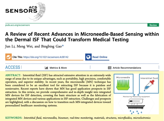 近日,BETWAY必威2021级药学专业本科生李骏在BETWAY必威高兵兵副教授指导下,以第一作者身份在分析化学知名SCI期刊《ACS Sensors》(中科院一区Top期刊,IF=8.9)上发表科研综述性论文,题为“A review of recent advances in microneedle-based sensing within the dermal ISF that could transform medical testing.”。该研究工作得到了国家自然基金、江苏省自然科学基金、BETWAY必威学科基金、国家级老员工创新创业训练计划项目的支持。