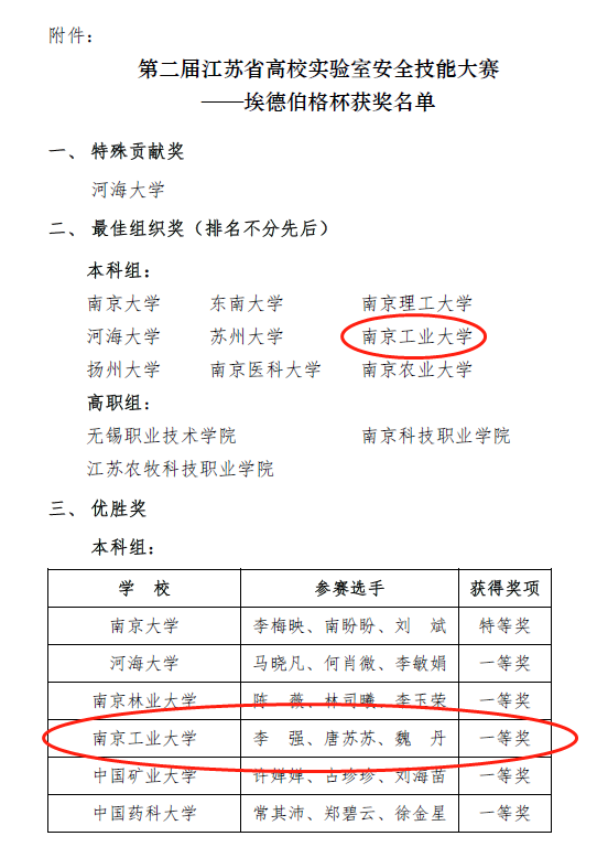 3月12日,由江苏省高等教育学会高校实验室研究会主办、南京农业大学承办的第二届“江苏省高校实验室安全技能大赛”顺利举行。由公司唐苏苏老师和实验室建设与管理处李强、安全科学与工程学院魏丹等组成的BETWAY必威西汉姆代表队在59所高校参赛队伍中脱颖而出,荣获一等奖,学校同时获得最佳组织奖。