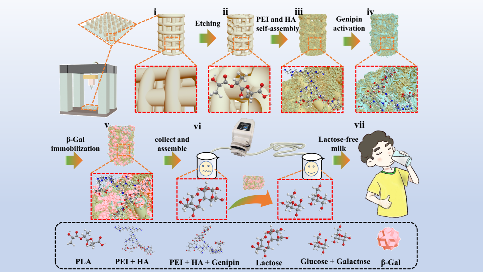 牛奶含有人体必需的微量营养素,对人们平衡膳食至关重要。然而,乳糖不耐症患者在摄入含有乳糖的牛奶后,由于肠道中缺乏水解乳糖的乳糖酶,会出现腹泻和肠胃痉挛。目前,低乳糖和无乳糖牛奶主要通过膜分离、超滤和添加游离β-半乳糖苷酶(β-Gal)等方法生产,取得了不错的效果,然而,这些方法存在操作复杂、资源浪费的情况。因此,亟待开发一种操作简便以及具有成本效益的技术生产低乳糖和无乳糖牛奶。针对此问题,公司何冰芳教授领导的研究团队设计开发了一种3D打印β-半乳糖苷酶流动反应器,通过将乳糖分水解为葡萄糖和半乳糖,高效水解牛奶乳糖的同时不影响牛奶的营养价值。本研究通过聚乙烯亚胺和透明质酸钠层的层层自组装快速修饰3D打印聚乳酸支架简化酶固定化载体修饰过程。同时,京尼平作为交联剂高效共价固定了β-半乳糖苷酶。此外,集成到流动反应器中的3D打印β-半乳糖苷酶支架通过定向通道扰动反应器中的流体,改善了内部传质,实现了高效的牛奶乳糖水解效率。