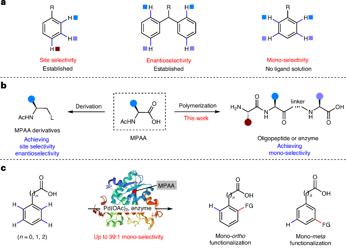 受金属酶催化中蛋白质骨架对反应选择性精准调控的启发,研究团队创新性地将商业化的酶(如Novozyme 435)作为大体积双功能配体引入钯催化体系。研究发现,酶配体巨大的空间位阻能够有效“保护”第一次官能化后生成的产物,阻止其进入催化循环发生第二次反应,从而实现优异的单选择性。机理研究证实,Pd-酶复合物是实现高选择性调控的活性物种,并且酶的一级结构、序列长度及疏水性氨基酸的比例是实现高选择性的关键。基于这些发现,团队进一步设计出一种含八个甘氨酸的寡肽配体,同样实现了与酶相媲美的单选择性控制。该研究为解决C-H活化中的单选择性挑战提供了通用且高效的策略,在药物分子和功能材料的精准合成中展现了重要的应用前景。