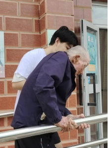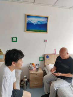 印象深刻的是在一楼与一位坐在轮椅上的奶奶相遇,老人家耳朵不太好,听不清大家说的什么,但看到来了年轻人,很开心,握着小同志的手乐呵呵的,经过奶奶的同意大家轮流接力推着奶奶围绕小楼走了一圈。